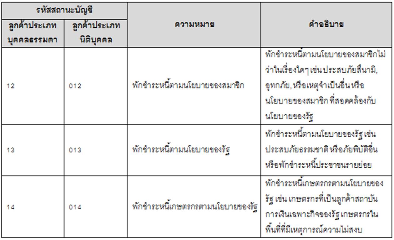 นอกจากนี้ คณะกรรมการคุ้มครองข้อมูลเครดิตได้ประกาศ เรื่องรหัสสถานะบัญชี เมื่อวันที่ 7 มิถุนายน 2555 เพื่อให้การประมวลผลของบริษัทข้อมูลเครดิตและการส่งข้อมูลของสมาชิกเกี่ยวกับสถานะบัญชีของลูกค้าที่ขอสินเชื่อมีมาตรฐานและเป็นไปในแนวทางเดียวกันและเพื่อให้ข้อมูลดังกล่าวสามารถแสดงสถานะทางการเงินของลูกค้าที่ขอสินเชื่ออย่างถูกต้องและชัดเจน อันจะเป็นการคุ้มครองมิให้เกิดความเสียหายแก่เจ้าของข้อมูล และจะทำให้สมาชิกหรือผู้ใช้บบริการสามารถนำข้อมูลไปใช้ประโยชน์ในการวิเคราะห์สินเชื่อและการออกบัตรเครดิตได้อย่างเหมาะสม โดยมีสาระสำคัญของรหัสสถานะบัญชีที่เกี่ยวกับโครงการชำระหนี้ดังนี้
