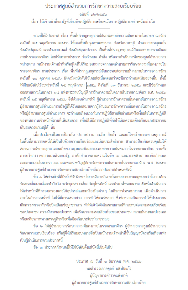 ทั้งนี้ ประกาศ ศอ.รส.ฉบับที่ 12 ได้รับการประกาศลงในราชกิจจานุเบกษา เมื่อวันที่ 1 ธันวาคม 2556