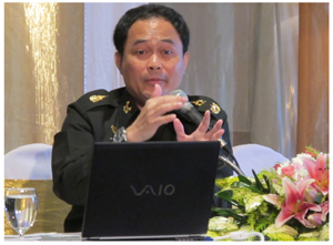 บรรยายภาพ : พล.ต.นักรบ ขณะกำลังบรรยายที่โรงแรมรอยัลริเวอร์ กรุงเทพฯ เมื่อวันอังคารที่ 18 ต.ค.2554