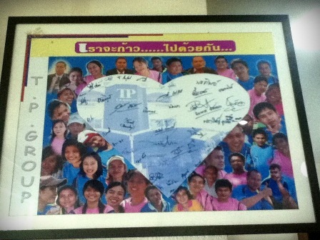 ภายในภาพของกรอบรูปดังกล่าว เป็นรูปถ่ายพนักงานของบริษัทจำนวนมากวางเรียงรายซ้อนกัน ล้อมรอบหัวใจดวงใหญ่ พร้อมมีลายเซ็น กำกับไว้ บนหัวใจ ซึ่งมีรูปนายณัฐวุฒิ และผู้บริหารคนอื่นของบริษัทร่วมอยู่ด้วย ขณะที่ด้านซ้ายของภาพ มีตัวอักษร T.P.GROP ส่วนด้านบนของภาพพิมพ์ตัวอักษร ว่า “เราจะก้าว...ไปด้วยกัน....” แสดงให้เห็นถึงความร่วมมือในการทำงานของทุกคน ที่จะนำพาให้บริษัทแห่งนี้ให้ประสบความสำเร็จ