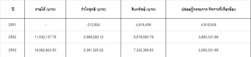 - ปี 2552 มีการระบุเงินให้กู้ยืมระยะสั้นแก่กรรมการ จำนวน 1,093,331.69 บาท และเงินให้กู้ยืมระยะสั้นแก่กิจการอื่น 2,800,000 บาท รวมเป็นเงิน 3,893,331,69 บาท ขณะที่บริษัทฯ แจ้งว่า มีรายได้รวม 11,530,137.79 บาท มีค่าใช้จ่ายรวม 8,146,475.65 บาท รวมกำไรสุทธิ 2,569,293.12 บาท