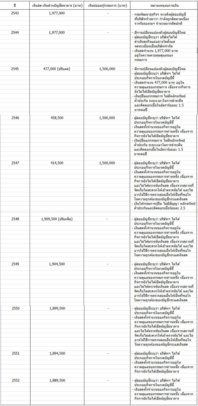 4. ผู้สอบบัญชี ระบุชัดเจน ในหมายเหตุงบการเงิน ปี 2544 – 2552 ว่า เงินสดทั้งจำนวนของกิจการ อยู่ในความดูแลของกรรมการท่านหนึ่ง เนื่องจากกิจการยังไม่ได้เปิดบัญชีธนาคาร