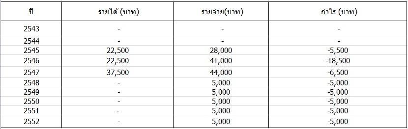 2. การดำเนินกิจการบริษัทประสบปัญหาขาดทุนต่อเนื่อง โดยในปี 2543-2544 ไม่มีรายได้เข้า ขณะที่ปี 2545 และ ปี 2546 มีรายได้ปีละ 22,500 บาท ปี 2547 มีรายได้ 37,500 บาท จากนั้นตั้งแต่ปี 2548 – 2552 ไม่มีรายได้เข้ามาอีกเลย
