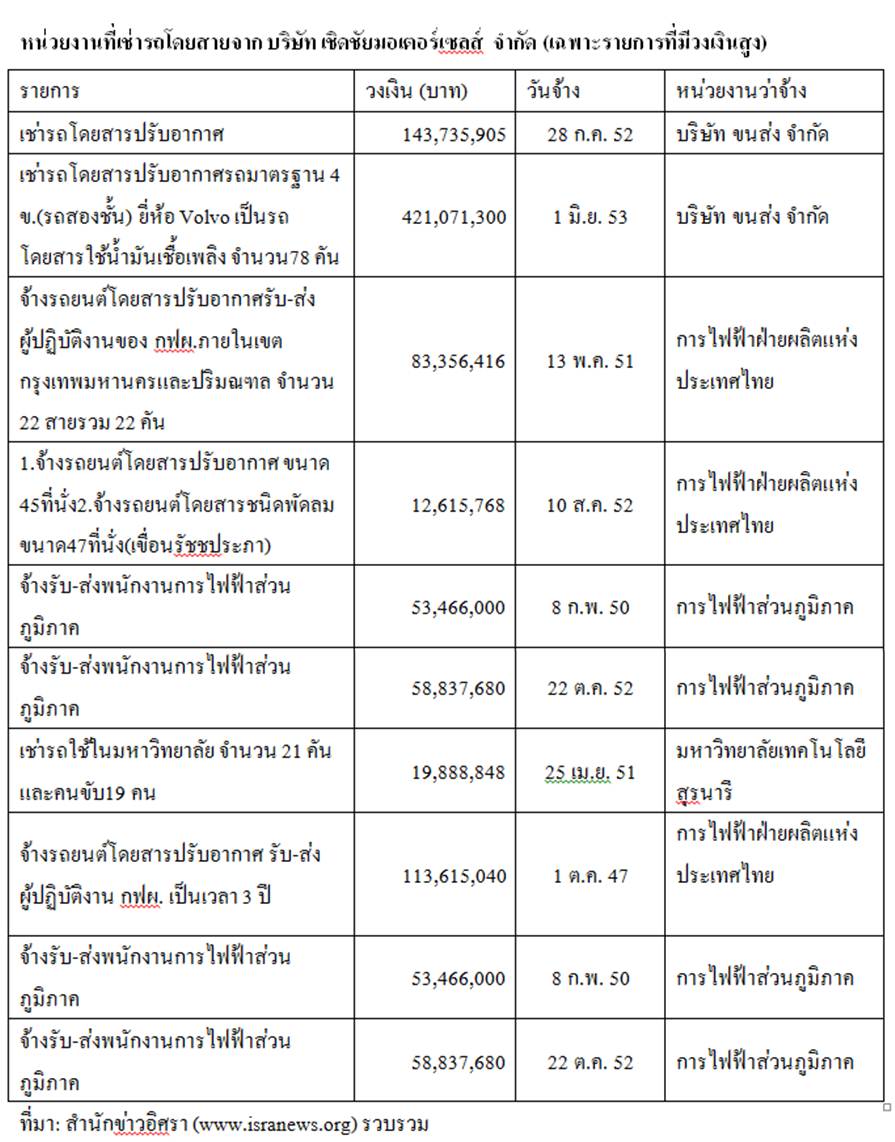 ขณะที่บริษัท เชิดชัย มอเตอร์เซลส์ จำกัด ได้รับว่าจ้างในการเช่ารถโดยสารและเช่ารถโดยสารรับ-ส่งพนักงานกับหน่วยงาน อาทิ บริษัท ขนส่ง จำกัด ,บริษัท กสท โทรคมนาคม จำกัด (มหาชน),บริษัท ทีโอที จำกัด (มหาชน) ,บริษัท ไปรษณีย์ไทย จำกัด ,การไฟฟ้าฝ่ายผลิตแห่งประเทศไทย ,การไฟฟ้าส่วนภูมิภาค ,มหาวิทยาลัยเทคโนโลยีสุรนารี ,องค์การเภสัชกรรม, กรมการขนส่งทหารเรือ รวมทั้งสิ้น 26 สัญญา วงเงิน 949,561,422 บาท (รวม 2 บริษัท 1,950.9 ล้านบาท)