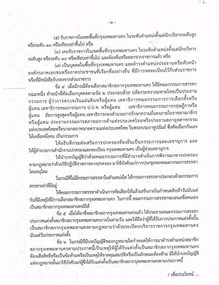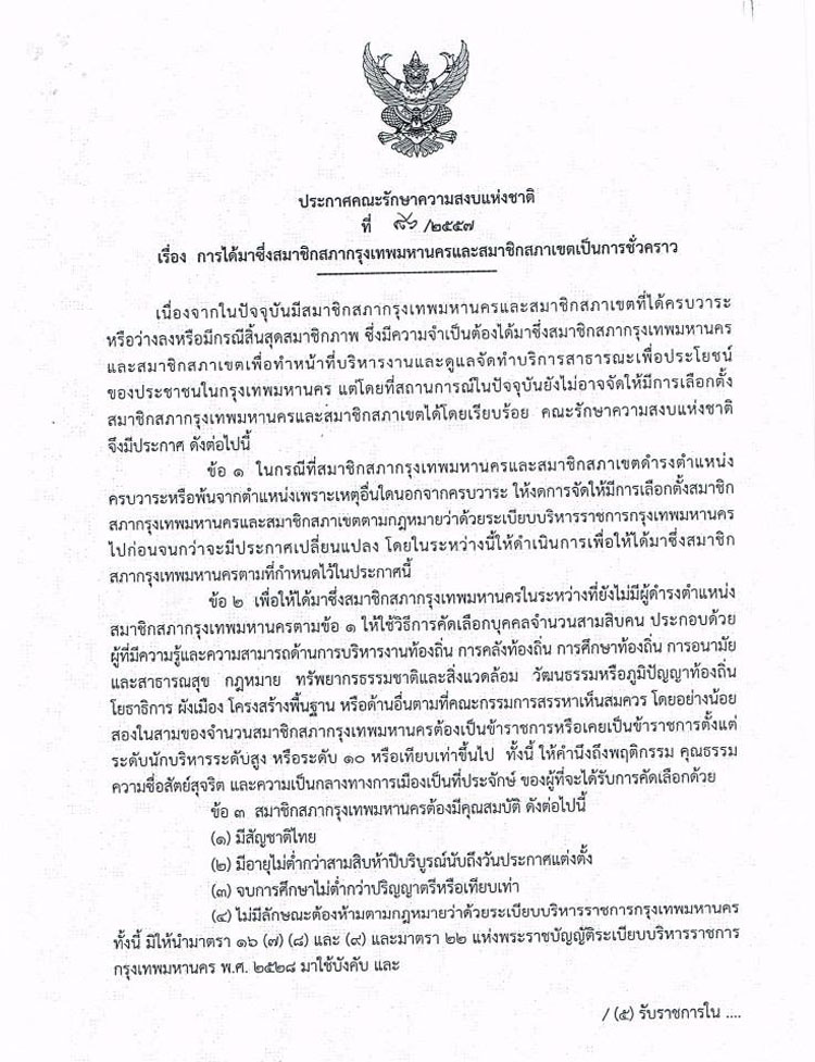 เรื่อง การได้มาซึ่งสมาชิกกรุงเทพมหานครและสมาชิกสภาเขตเป็นการชั่วคราว