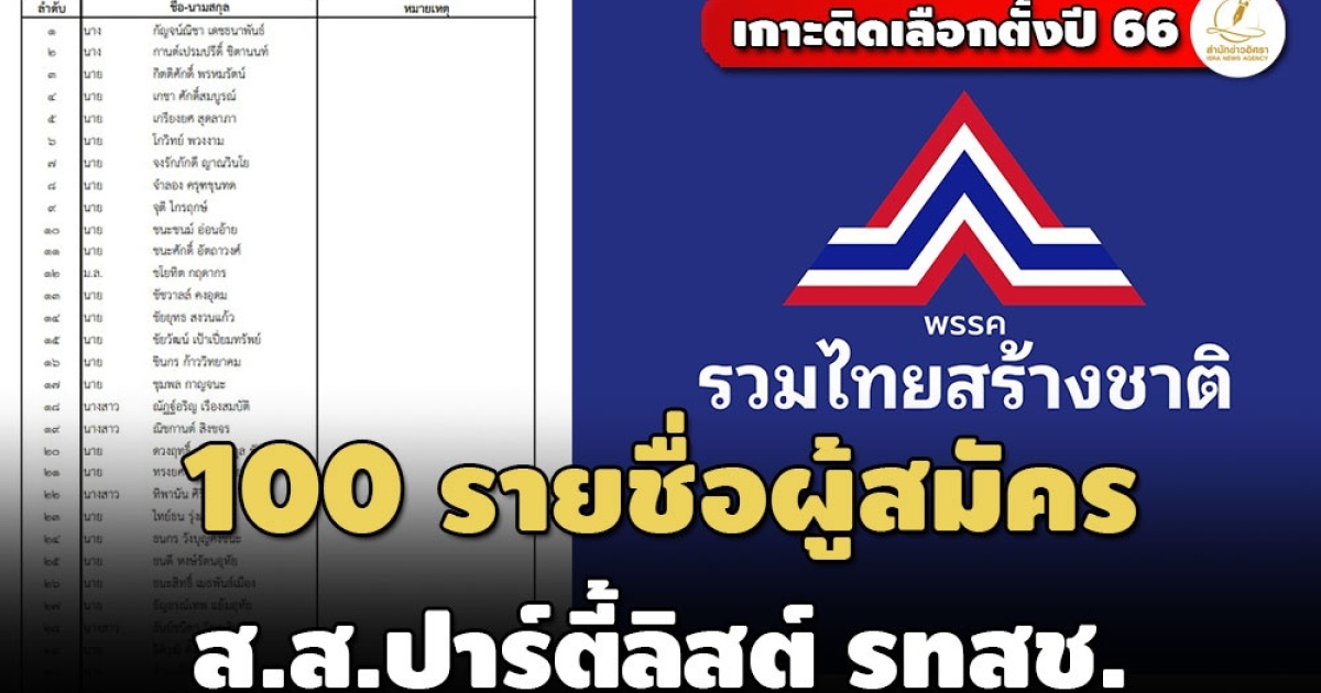 เปิดรายชื่อผู้สมัครรับเลือกตั้ง ส.ส.แบบบัญชีรายชื่อพรรครวมไทยสร้างชาติ 100 คน ไร้ชื่อ 'พลเอกประยุทธ์ จันทร์โอชา'