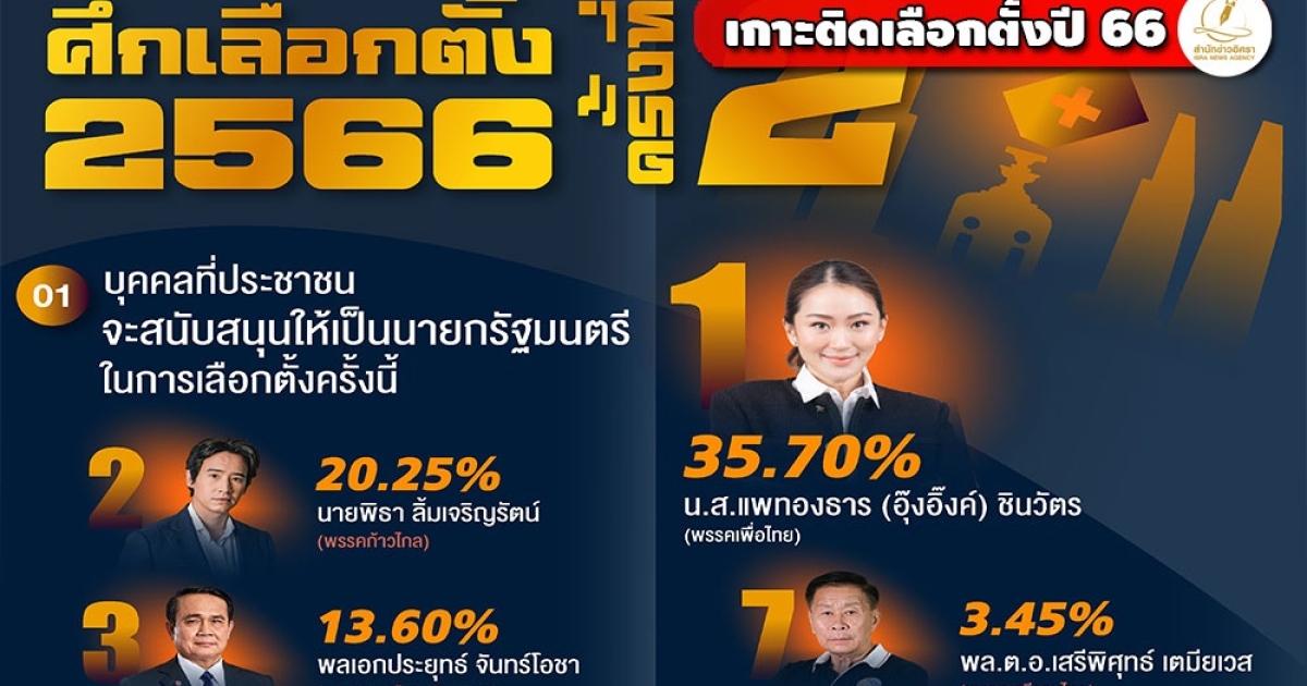 นิด้าโพลเผยผลสำรวจความเห็นประชาชน 'ศึกเลือกตั้ง 66 ครั้งที่ 2' พบจะเลือกนายก 'อุ๊งอิ๊ง' อันดับ 1 รองมา 'พิธา-ประยุทธ์' ด้าน 'เศรษฐา' ติดอันดับ 5