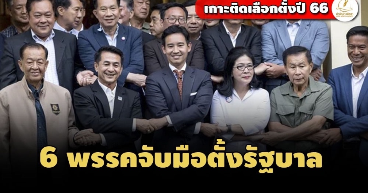6 พรรค จับมือร่วมรัฐบาล 'ก้าวไกล' บรรยากาศชื่นมื่น ที่ห้องอาหารย่าน ถ.สุโขทัย หลังถกนาน 1 ชั่วโมง ออกมาจับมือโชว์สื่อมวลชน เตรียมแถลงข่าวแจ้งรายละเอียดให้ทราบอย่างเป็นทางการพรุ่งนี้