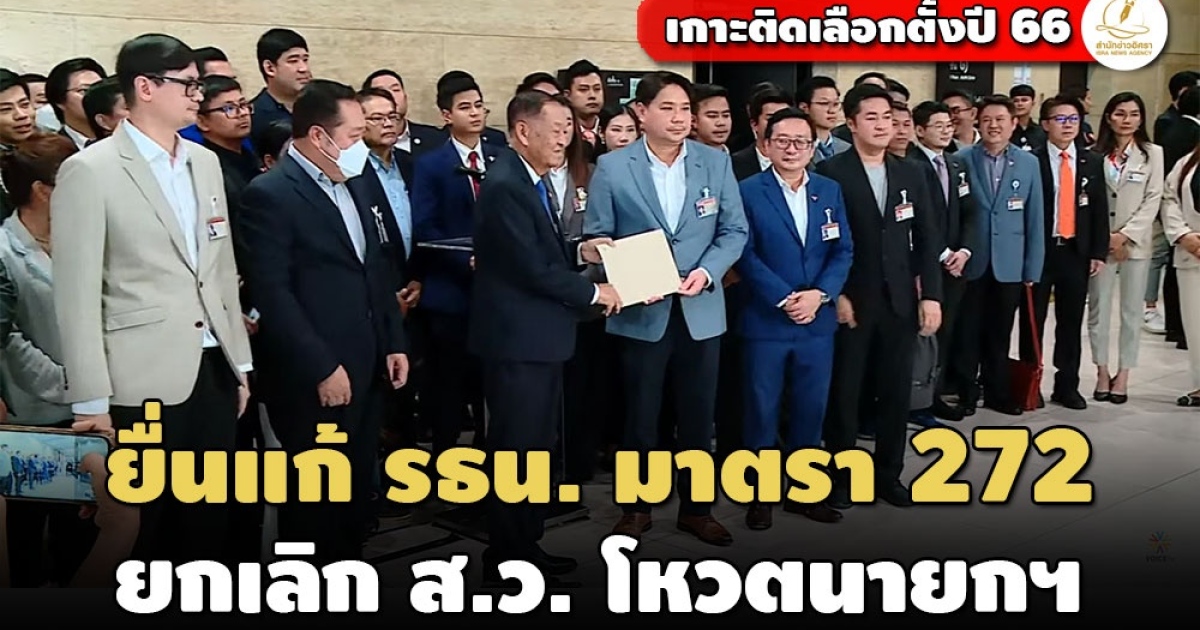 สำนักข่าวอิศรา (www.isara.news.org) รายงานว่า เมื่อวันที่ 14 ก.ค. 2566 พรรคก้าวไกล ยื่นร่างรัฐธรรมนูญแก้ไข มาตรา 272 ยกเลิกอำนาจสมาชิกวุฒิสภา ( ส.ว.)เลือกนายกรัฐมนตรี