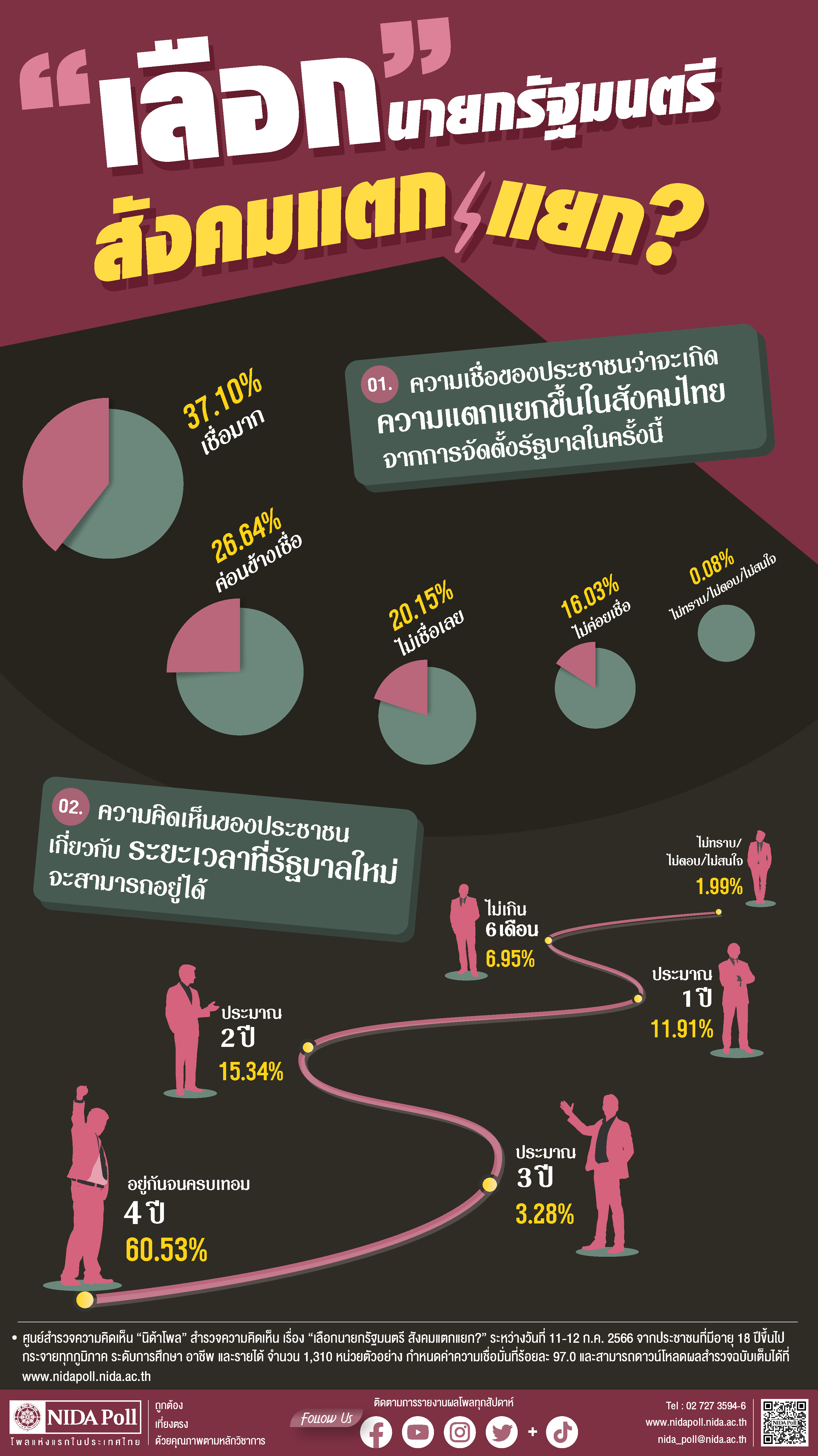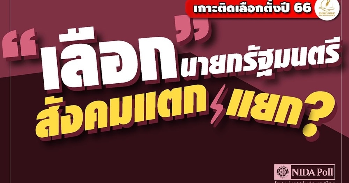 สำนักข่าวอิศรา (www.isranews.org) รายงานว่า เมื่อวันที่ 23 ก.ค. 2566 ศูนย์สำรวจความคิดเห็น 'นิด้าโพล' สถาบันบัณฑิตพัฒนบริหารศาสตร์ (นิด้า) เปิดเผยผลสำรวจของประชาชน เรื่อง “เลือกนายกรัฐมนตรี สังคมแตกแยก?” ทำการสำรวจระหว่างวันที่ 11-12 กรกฎาคม 2566 จากประชาชนที่มีอายุ 18 ปีขึ้นไป กระจายทุกภูมิภาค ระดับการศึกษา อาชีพ และรายได้ทั่วประเทศ รวมทั้งสิ้น จำนวน 1,310 หน่วยตัวอย่าง เกี่ยวกับการเลือกนายกรัฐมนตรีทำให้เกิดความแตกแยกในสังคมไทยหรือไม่ การสำรวจอาศัยการสุ่มตัวอย่างโดยใช้ความน่าจะเป็นจากบัญชีรายชื่อฐานข้อมูลตัวอย่างหลัก (Master Sample) ของ “นิด้าโพล” สุ่มตัวอย่างด้วยวิธีแบบง่าย (Simple Random Sampling) เก็บข้อมูลด้วยวิธีการสัมภาษณ์ทางโทรศัพท์ โดยกำหนดค่าความเชื่อมั่น ร้อยละ 97.0