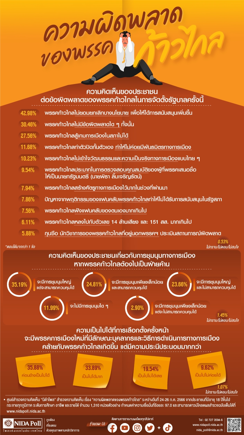 สำนักข่าวอิศรา (www.isranews.org) รายงานว่า เมื่อวันที่ 30 ก.ค. 2566 ศูนย์สำรวจความคิดเห็น 'นิด้าโพล' สถาบันบัณฑิตพัฒนบริหารศาสตร์ (นิด้า) เปิดเผยผลสำรวจของประชาชน เรื่อง 'ความผิดพลาดของพรรคก้าวไกล' ทำการสำรวจระหว่างวันที่ 24-26 กรกฎาคม 2566 จากประชาชนที่มีอายุ 18 ปีขึ้นไป กระจายทุกภูมิภาค ระดับการศึกษา อาชีพ และรายได้ ทั่วประเทศ รวมทั้งสิ้น จำนวน 1,310 หน่วยตัวอย่าง เกี่ยวกับข้อผิดพลาดของพรรคก้าวไกลในการจัดตั้งรัฐบาลครั้งนี้ การสำรวจอาศัยการสุ่มตัวอย่างโดยใช้ความน่าจะเป็นจากบัญชีรายชื่อฐานข้อมูลตัวอย่างหลัก (Master Sample) ของ 'นิด้าโพล' สุ่มตัวอย่างด้วยวิธีแบบง่าย (Simple Random Sampling) เก็บข้อมูลด้วยวิธีการสัมภาษณ์ทางโทรศัพท์ โดยกำหนดค่าความเชื่อมั่น ร้อยละ 97.0