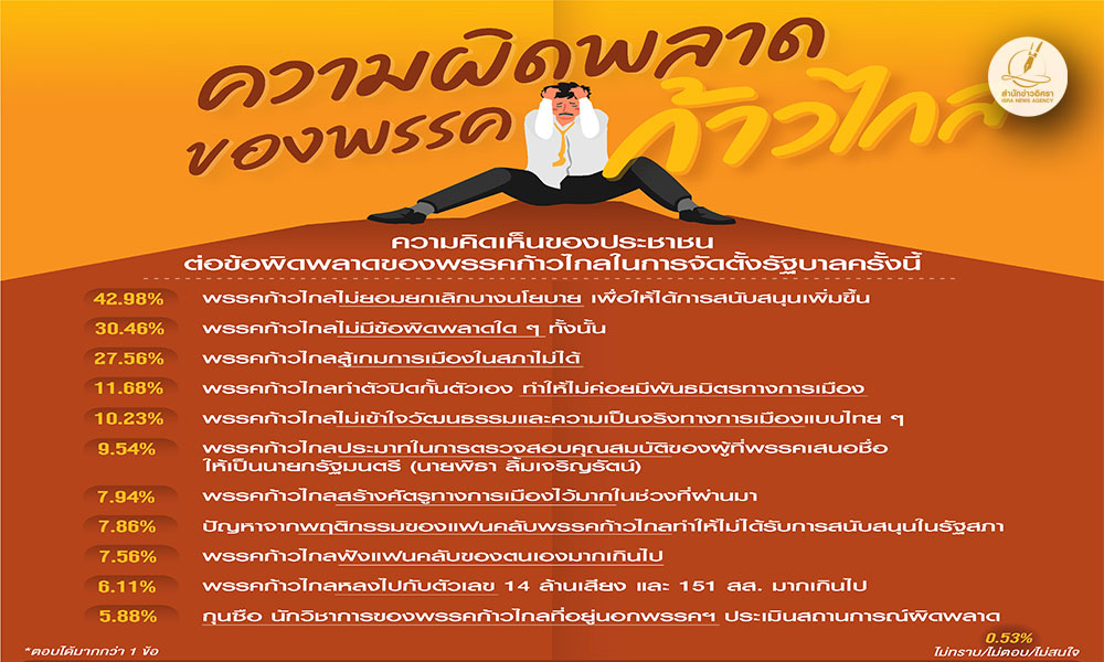 จากการสำรวจเมื่อถามถึงความคิดเห็นของประชาชนต่อข้อผิดพลาดของพรรคก้าวไกลในการจัดตั้งรัฐบาลครั้งนี้ พบว่า
