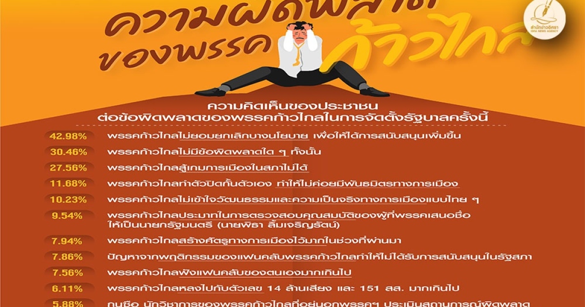 นิด้าโพลเผยความเห็นประชาชนต่อข้อผิดพลาดของพรรคก้าวไกลในการจัดตั้งรัฐบาล 42.98% มองว่าพรรคก้าวไกลไม่ยอมยกเลิกบางนโยบาย เพื่อให้ได้การสนับสนุนเพิ่มขึ้น 30.46% ไม่มีข้อผิดพลาดใด ๆ ทั้งนั้น 27.56% สู้เกมการเมืองในสภาไม่ได้