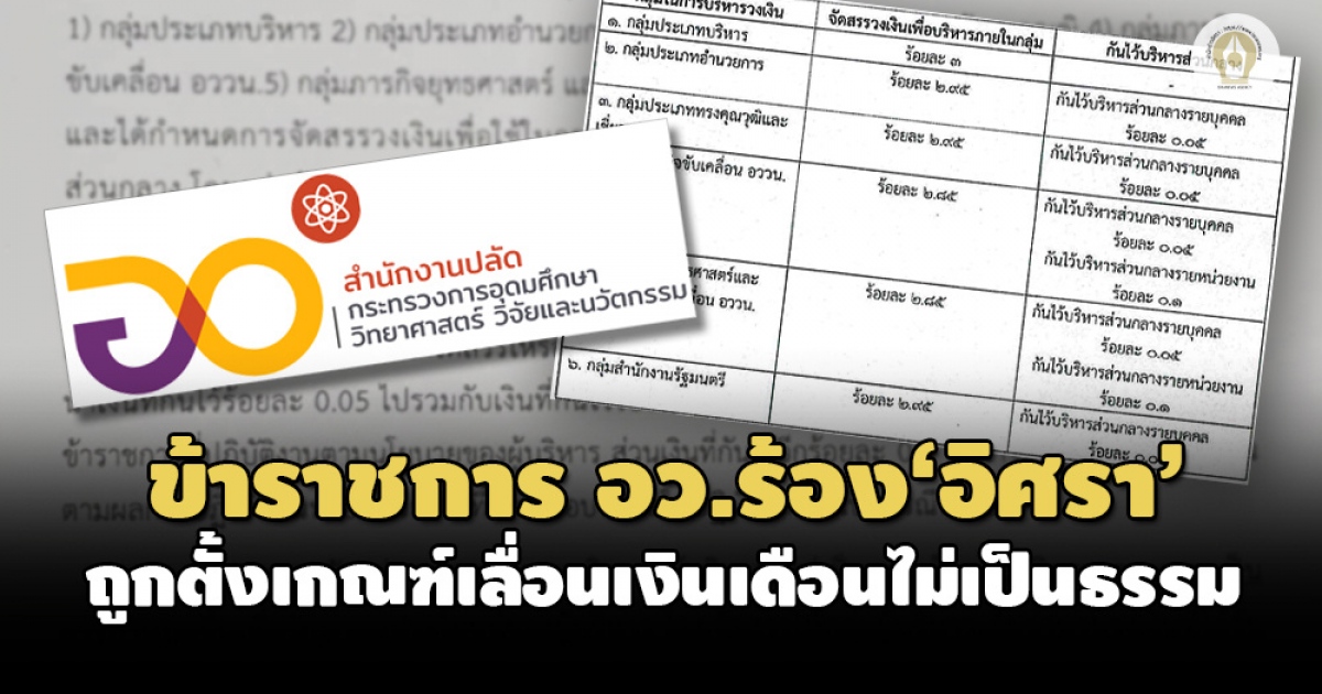 สำนักข่าวอิศรา (www.isranews.org) รายงานว่า เมื่อเร็วๆ นี้ ได้รับเรื่องร้องเรียนจากข้าราชการในสังกัดสำนักงานปลัดกระทรวงการอุดมศึกษา วิทยาศาสตร์ วิจัยและนวัตกรรม (สป.อว.) เพื่อขอความเป็นธรรม กรณีที่กระทรวงออกประกาศ เกี่ยวกับ หลักเกณฑ์และเงื่อนไขการบริหารวงเงินการเลื่อนเงินเดือน รอบการประเมินที่ 2 ปีงบประมาณ 2564 โดยพบว่า การแบ่งกลุ่มข้าราชการเพื่อใช้ในการเลื่อนเงินเดือน และกำหนดสัดส่วนการจัดสรรวงเงินเพื่อใช้ในการเลื่อนเงินเพื่อบริหารแต่ละกลุ่มไม่เท่ากัน ทำให้เกิดการได้เปรียบเสียเปรียบในการบริหาร