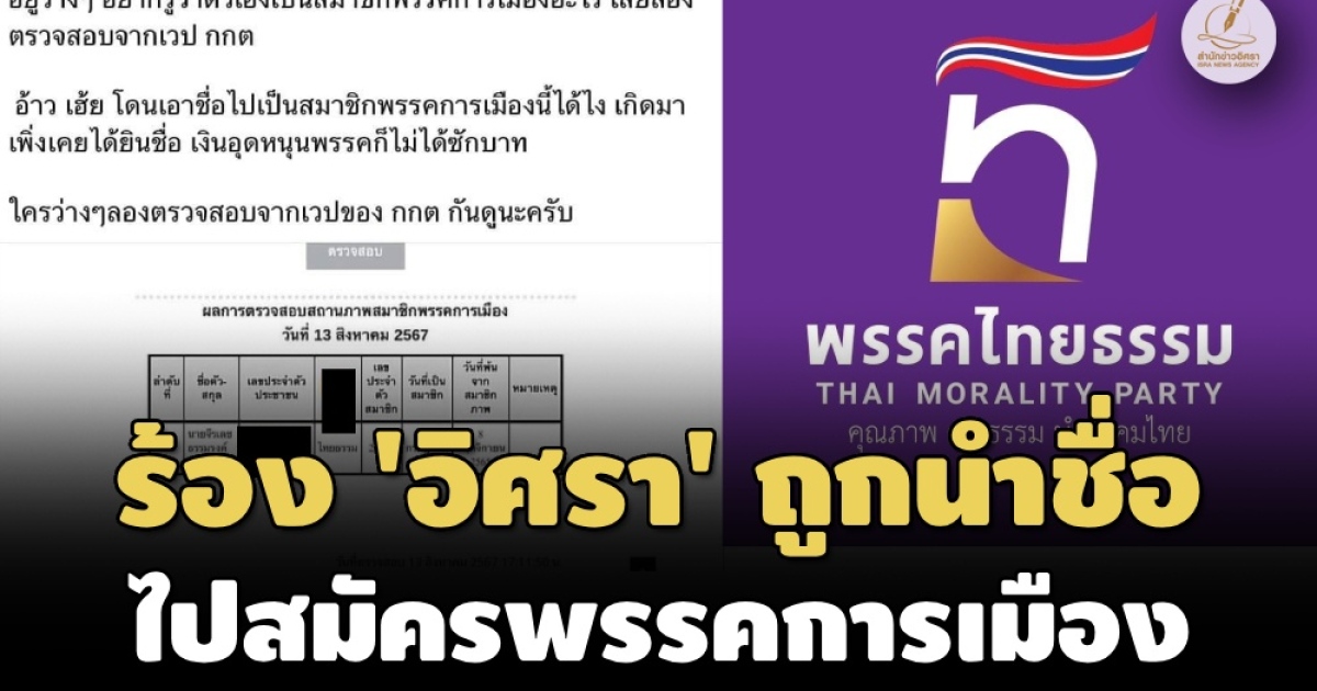 ร้อง 'อิศรา' ถูกนำชื่อไปสมัครสมาชิกพรรค 'ไทยธรรม' ด้าน 'อโณทัย ดวงดารา' หัวหน้าพรรคแจง มีสมาชิกจำนวนมาก ขอตรวจสอบก่อน