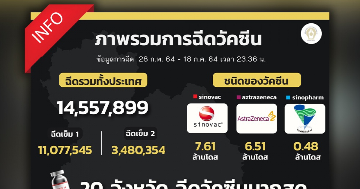 นับตั้งแต่การฉีดวัคซีนวันแรก 28 ก.พ.2564 จนถึงวันที่ 18 ก.ค.2564 ณ เวลา 23.36 น. รวมระยะเวลา 141 วัน หรือเกือบ 5 เดือน ประเทศไทย ฉีดวัคซีนไปแล้ว 14,557,899 โดส แบ่งเป็น วัคซีนเข็มแรก 11,077,545 โดส วัคซีนเข็มสอง 3,480,354 โดส