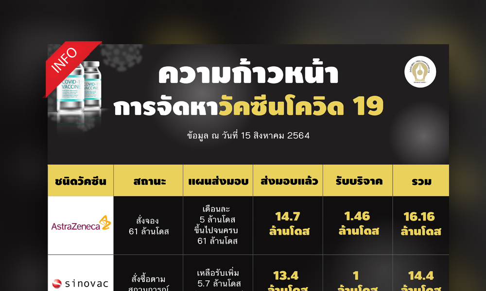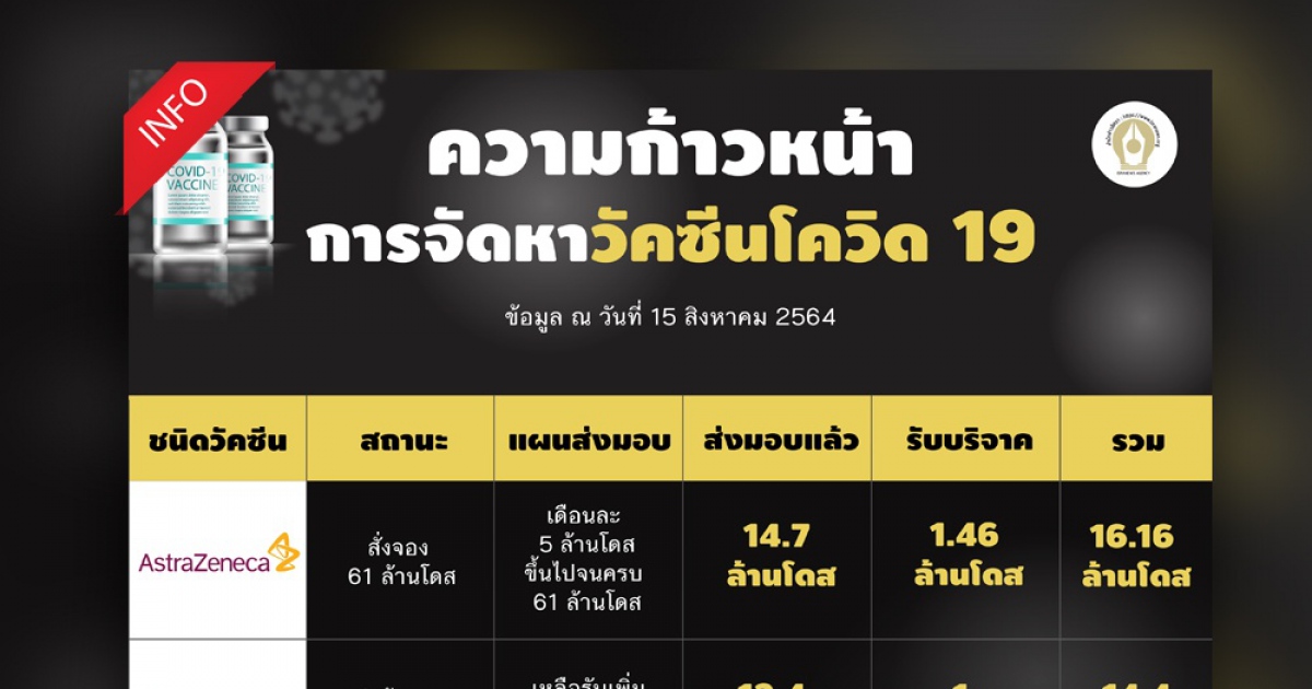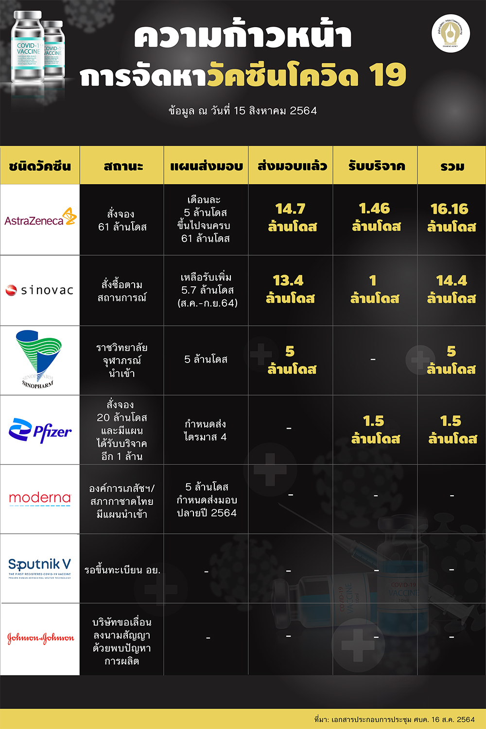 INFO : ความก้าวหน้าจัดหาวัคซีน โควิด19 ตามแผนการจัดหาวัคซีนของไทย ข้อมูลมติ ศบค. 15 ส.ค.2564
