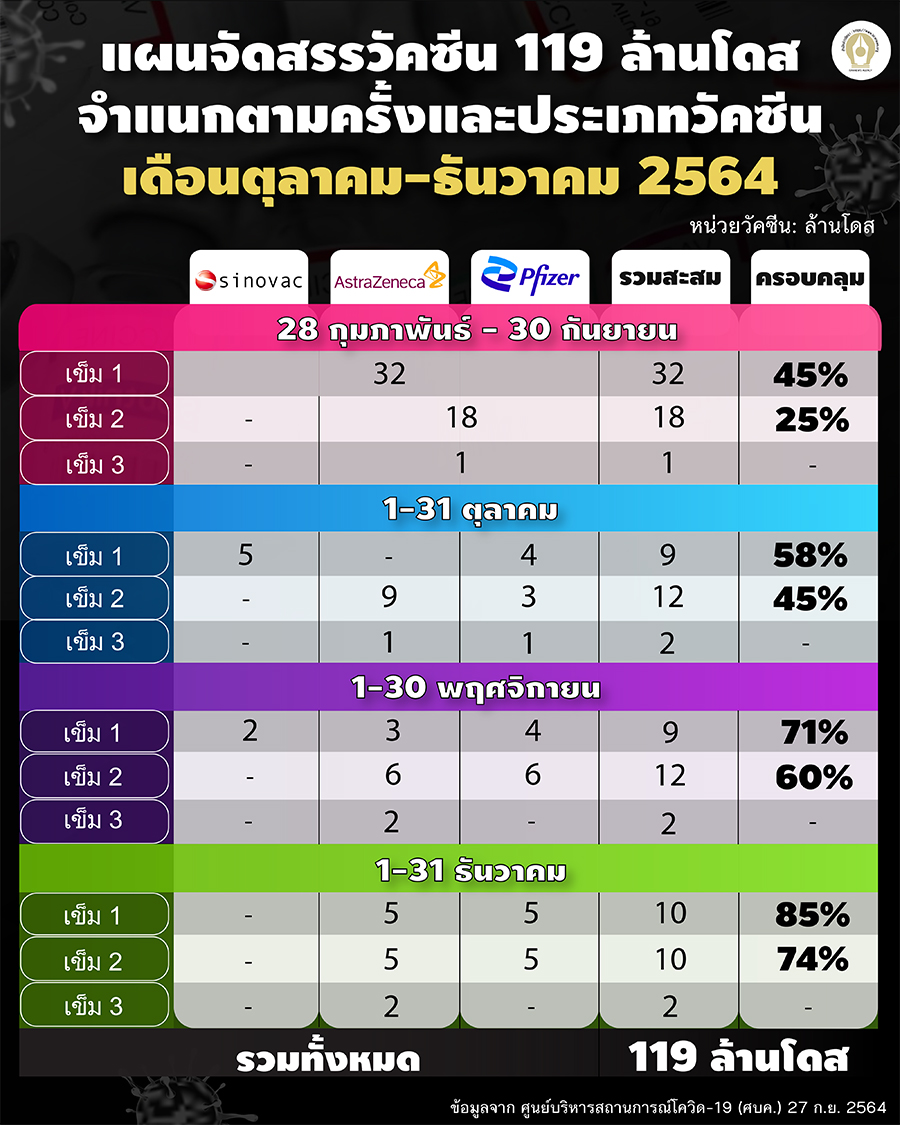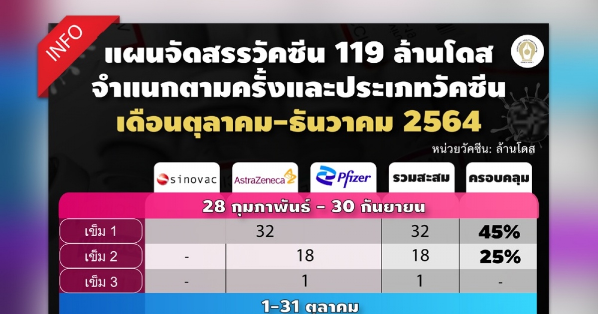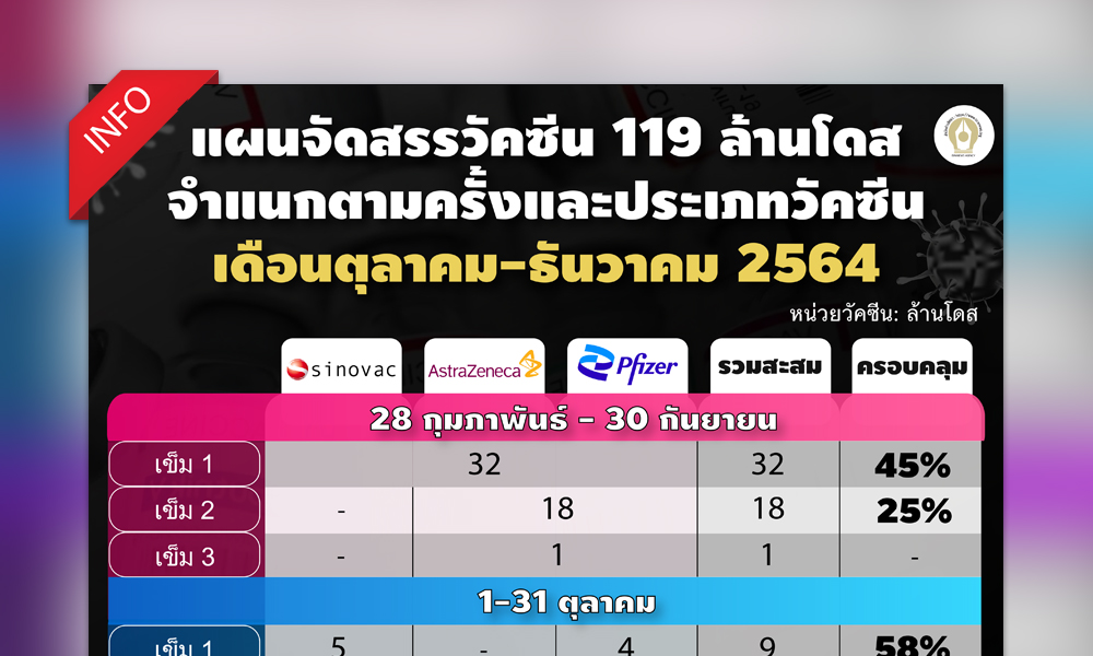 INFO : แผนจัดสรรวัคซีน 119 ล้านโดส จำแนกตามครั้งและประเภทวัคซีน เดือน ต.ค. - ธ.ค. 2564