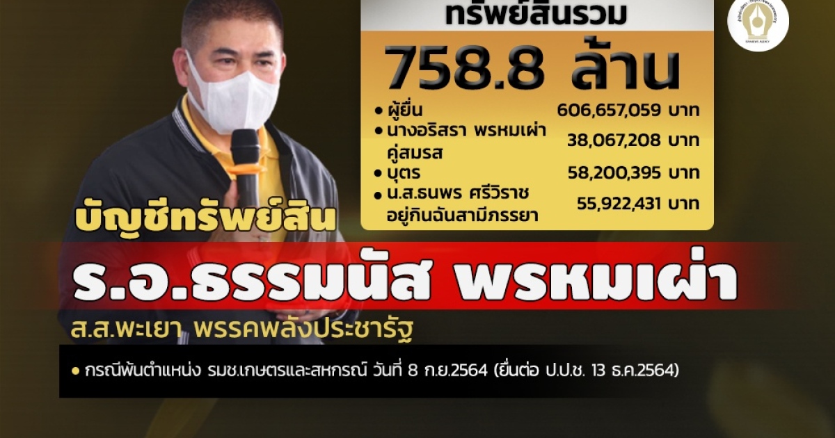 สำนักงานคณะกรรมการป้องกันและปราบปรามการทุจริตแห่งชาติ (ป.ป.ช.) เปิดเผยบัญชีแสดงรายการทรัพย์สินและหนี้สินของ ร.อ. ธรรมนัส พรหมเผ่า ส.ส.พะเยา พรรคพลังประชารัฐ กรณีพ้นตำแหน่งรัฐมนตรีช่วยว่าการกระทรวงเกษตรและสหกรณ์ วันที่ 8 ก.ย.2564 (ยื่นต่อ ป.ป.ช.วันที่ 13 ธ.ค.2564)