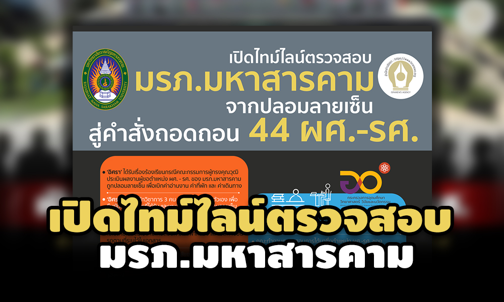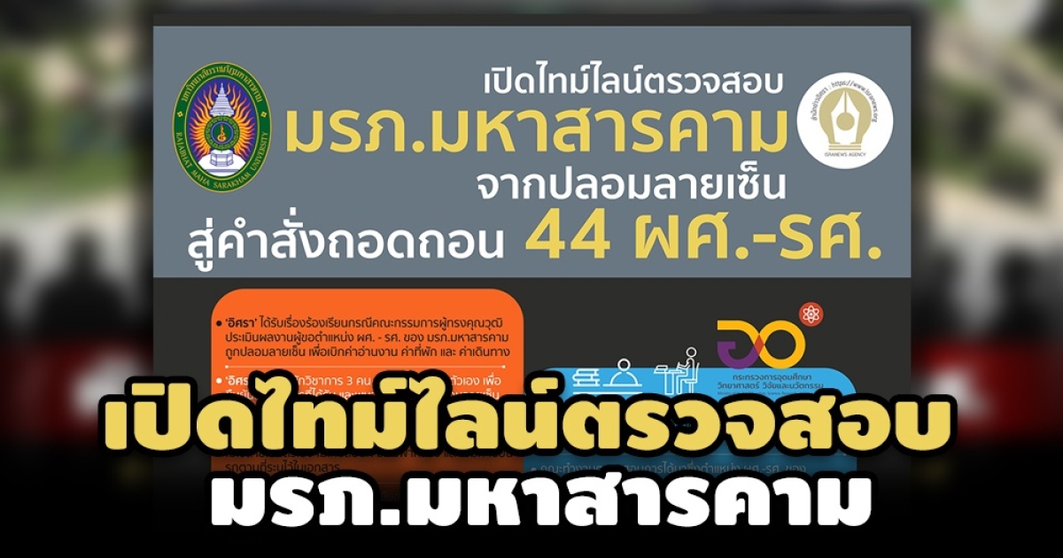 สำนักข่าวอิศรา (www.isranews.org) สรุปไทม์ไลน์การตรวจสอบ มรภ.มหาสารคามจากกรณีปลอมลายเซ็นผู้ทรงคุณวุฒิประเมินผลงานทางวิชาการ สู่คำสั่งถอดถอนผู้ช่วยศาสตราจารย์ (ผศ.) และ รองศาสตราจารย์ (รศ.) รวม 44 ราย