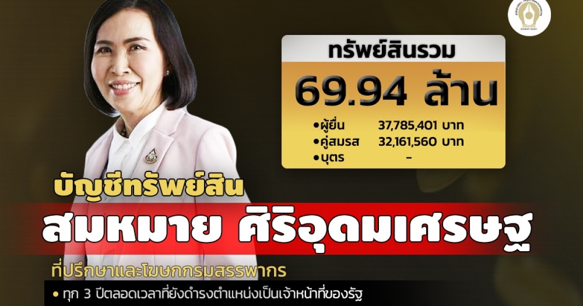 ป.ป.ช.เปิดเผยบัญชีแสดงรายการทรัพย์สินและหนี้สิน ราย นางสมหมาย ศิริอุดมเศรษฐ อายุ 59 ปี กรณีทุกสามปีตลอดเวลาที่ยังดำรงตำแหน่งเป็นเจ้าหน้าที่ของรัฐ วันที่ 10 ก.พ.2565 รวมทรัพย์สินทั้งสิ้น 69,946,962.76 บาท (เงินฝาก 17,227,415.90 บาท ) หนี้สิน 5,025,811.29 บาท