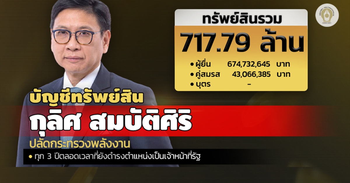 ป.ป.ช.เปิดเผยบัญชีแสดงรายการทรัพย์สินและหนี้สินเจ้าหน้าที่ระดับสูง เมื่อวันที่ 27 ธ.ค.2564 รายของ นายกุลิศ สมบัติศิริ ปลัดกระทรวงพลังงาน และภรรยา กรณีทุก 3 ปีตลอดเวลาที่ยังดำรงตำแหน่งเป็นเจ้าหน้าที่ของรัฐ มีทรัพย์สินรวมทั้งสิ้น 717,799,030.49 บาท ไม่มีหนี้สิน