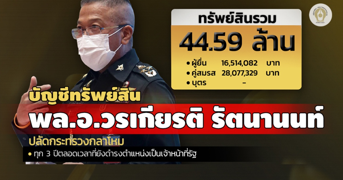 เมื่อวันที่ 25 ก.พ.2565 ป.ป.ช.เปิดเผยบัญชีทรัพย์สินและหนี้สิน ของ พล.อ.วรเกียรติ รัตนานนท์ ปลัดกระทรวงกลาโหม กรณีทุก 3 ปีที่ยังดำรงตำแหน่งเป็นเจ้าหน้าที่ของรัฐ มีทรัพย์สินทั้งสิ้น 44,591,412.54 บาท หนี้สิน 303,947.11 บาท