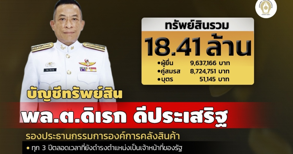 เมื่อวันที่ 1 มี.ค.2565 สำนักงานคณะกรรมการป้องกันและปราบปรามการทุจริตแห่งชาติ (ป.ป.ช.) เปิดเผยบัญชีทรัพย์สินและหนี้สินและเอกสารประกอบของผู้ดำรงตำแหน่งระดับสูง รายของ พล.ต.ดิเรก ดีประเสริฐ รองประธานกรรมการองค์การคลังสินค้า และรองเจ้ากรมยุทธศึกษาทหารบก กรมยุทธศึกษาทหารบก กรณีทุก 3 ปีตลอดเวลาที่ยังดำรงตำแหน่งเป็นเจ้าหน้าที่ของรัฐ รวมทรัพย์สินทั้งสิ้น 18,413,072 บาท หนี้สิน 901,919 บาท