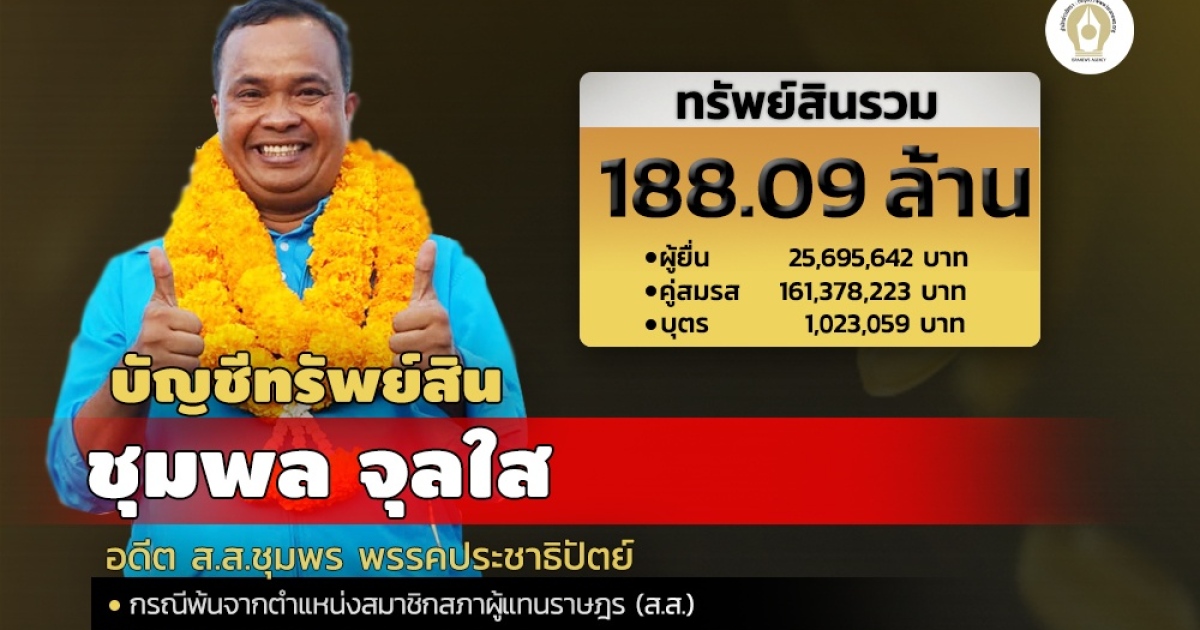 เมื่อวันที่ 7 มี.ค.2565 สำนักงานคณะกรรมการป้องกันและปราบปรามการทุจริตแห่งชาติ (ป.ป.ช.) เปิดเผยบัญชีทรัพย์สินและหนี้สินและเอกสารประกอบของผู้ดำรงตำแหน่งระดับสูง กรณีพ้นจากตำแหน่งสมาชิกสภาผู้แทนราษฎร (ส.ส.) สังกัดพรรคประชาธิปัตย์ นายชุมพล จุลใส รวมทรัพย์สินทั้งสิ้น 188,096,925.51 บาท (ที่ดิน 29 แปลง ส่วนใหญ่อยู่ในชุมพร รวม 112,800,000 บาท อพาร์ทเม้นท์ อ.เมือง จ.ชุมพร 40,000,000 บาท) หนี้สิน 67,998,504.43 บาท
