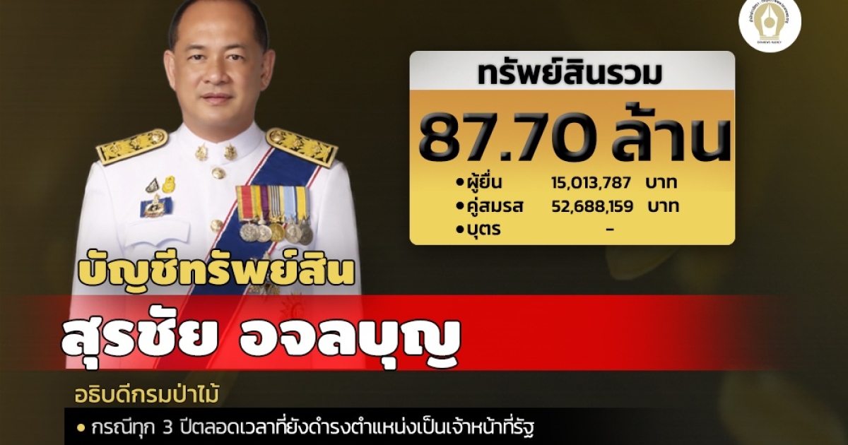 ป.ป.ช.เปิดเผยบัญชีทรัพย์สินและหนี้สินและเอกสารประกอบของผู้ดำรงตำแหน่งระดับสูง รายของ นายสุรชัย อจลบุญ อธิบดีกรมป่าไม้ และ กรรมการองค์การอุตสาหกรรมป่าไม้ กรณีทุก 3 ปีตลอดเวลาที่ยังดำรงตำแหน่งเป็นเจ้าหน้าที่ของรัฐ เมื่อวันที่ 2 ธ.ค.2564 รวมทรัพย์สินทั้งสิ้น 87,701,957.20 บาท (เงินสด 1,900,000 บาท เงินฝาก 17 บัญชี 10,836,184.85 บาท ที่ดิน 5 แปลง บ้าน ห้องชุด 4 หลัง รวม 24,942,000 บาท) หนี้สิน 217,353.70 บาท
