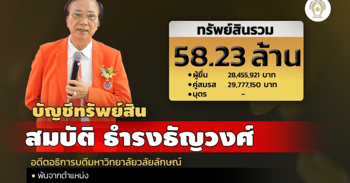 ป.ป.ช.เปิดเผยบัญชีทรัพย์สินและหนี้สินและเอกสารประกอบของผู้ดำรงตำแหน่งระดับสูง รายของสมบัติ ธำรงธัญวงศ์ อดีตอธิการบดีมหาวิทยาลัยวลัยลักษณ์ กรณีพ้นตำแหน่ง ทรัพย์สินรวม 58,233,072 บาท