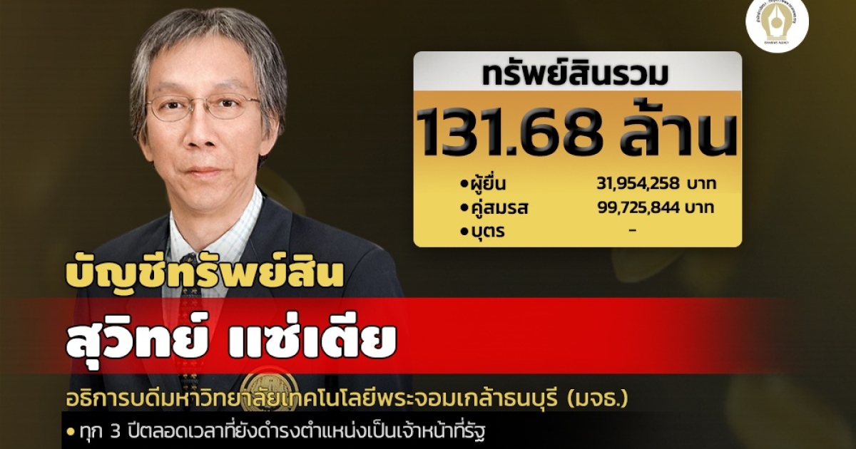 เมื่อวันที่ 18 มี.ค.2565 ป.ป.ช.เปิดเผยบัญชีทรัพย์สินและหนี้สินและเอกสารประกอบของผู้ดำรงตำแหน่งระดับสูง รายของ นายสุวิทย์ แซ่เตีย อธิการบดีมหาวิทยาลัยเทคโนโลยีพระจอมเกล้าธนบุรี (มจธ.) กรณี ทุก 3 ปีตลอดเวลาที่ยังดำรงตำแหน่งเป็นเจ้าหน้าที่ของรัฐ รวมทรัพย์สินทั้งสิ้น 131,680,103.55 บาท ไม่มีหนี้สิน