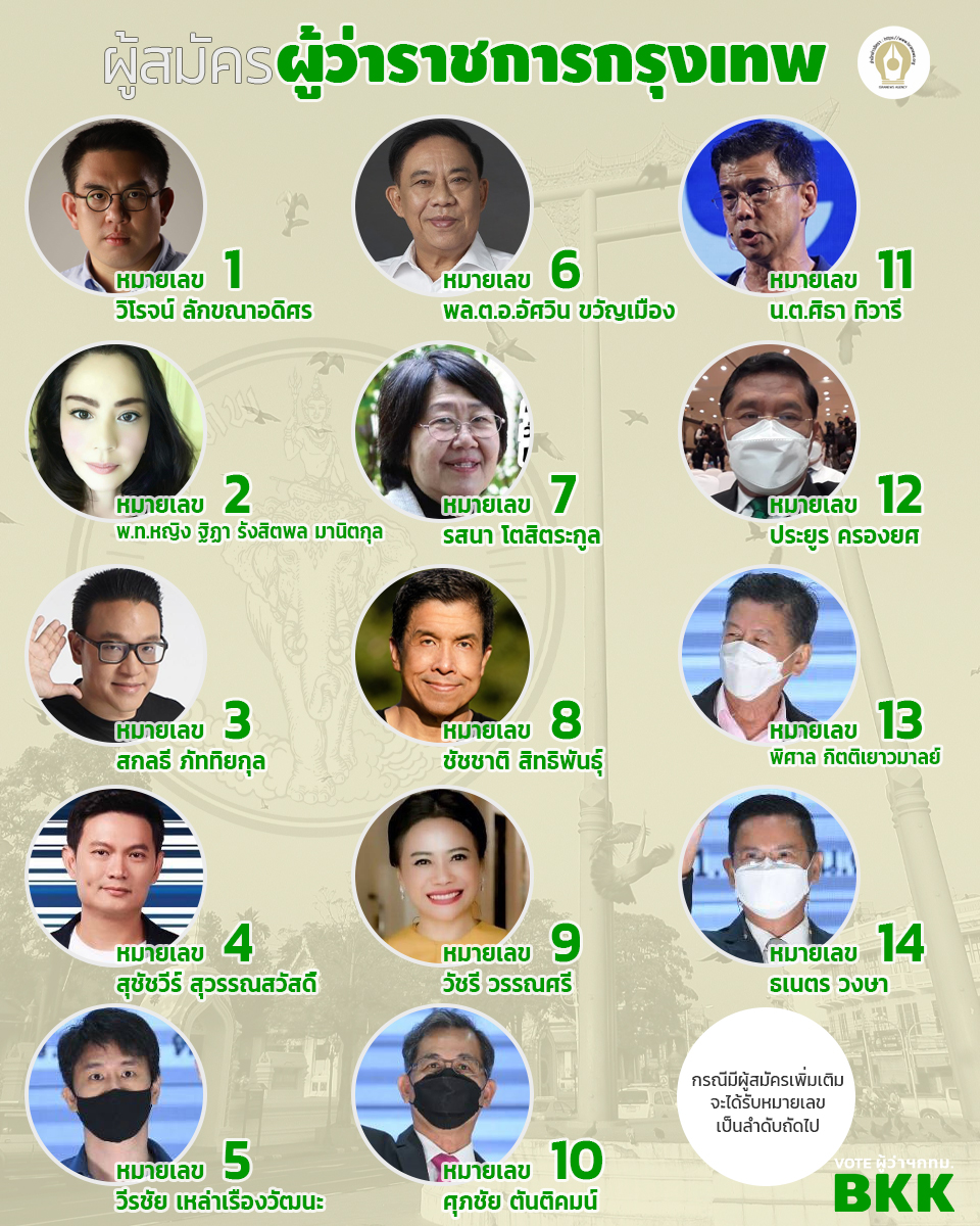 31 มี.ค.2565 วันแรกของการเปิดรับสมัรผู้ว่าราชการกรุงเทพมหานคร มีผู้สมัครแล้ว 14 คน โดยได้มีการจับสลากหมายเลขผู้สมัครเป็นที่เรียบร้อย ซึ่งการเปิดรับสมัครจะดำเนินการระหว่างวันที่ 31 มี.ค.-4 เม.ย. โดยกรณีที่มีผู้สมัครเพิ่มเติม จะได้รับหมายเลขเป็นลำดับถัดไป