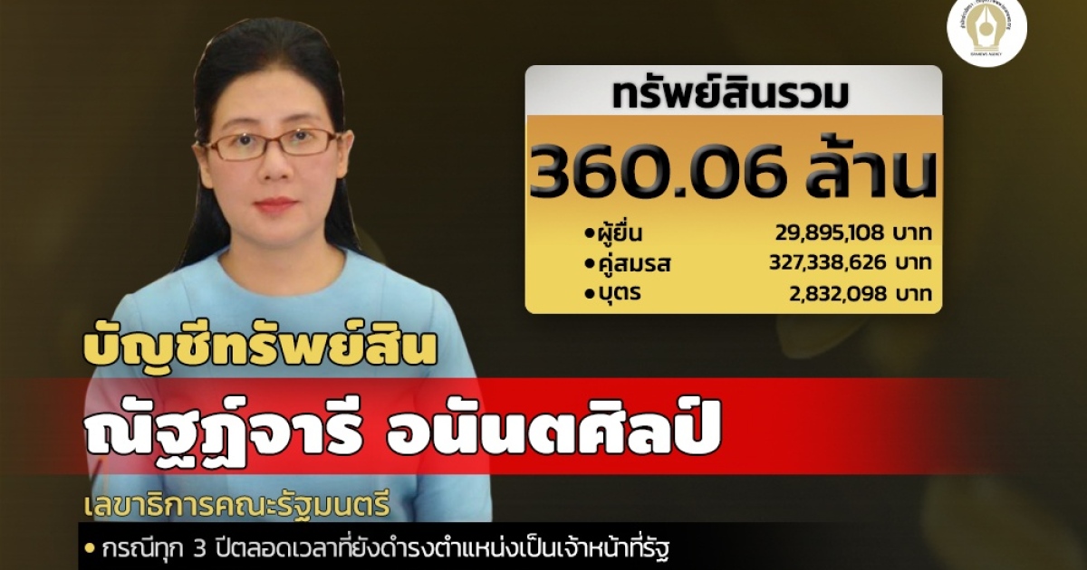 เมื่อวันที่ 28 มี.ค.2565 ป.ป.ช.เปิดเผยบัญชีทรัพย์สินและหนี้สินและเอกสารประกอบของผู้ดำรงตำแหน่งระดับสูง รายของ นางณัฐฏ์จารี อนันตศิลป์ เลขาธิการคณะรัฐมนตรี กรณีทุก 3 ปีตลอดเวลาที่ยังดำรงตำแหน่งเป็นเจ้าหน้าที่รัฐ รวมทรัพย์สินทั้งสิ้น 360,065,832.90 บาท หนี้สิน 167,298.698 บาท