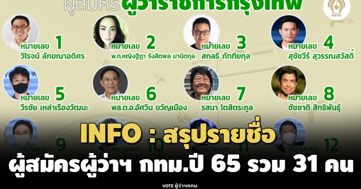 เลือกตั้งผู้ว่าราชการกรุงเทพมหานคร ปี 2565 สรุปมีผู้สมัครทั้งหมด 31 คน ทั้งในนามพรรคการเมือง-อิสระ ขั้นตอนจากนี้ กทม.จะตรวจสอบคุณสมบัติและลักษณะต้องห้าม ก่อนประกาศรายชื่อผู้สมัครรับเลือกตั้งภายใน 7 วัน หรือวันที่ 11 เม.ย.2565