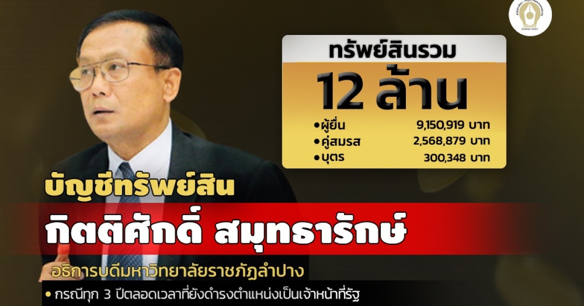 เมื่อวันที่ 28 มี.ค.2565 สำนักงานคณะกรรมการป้องกันและปราบปรามการทุจริตแห่งชาติ (ป.ป.ช.) เปิดเผยบัญชีทรัพย์สินและหนี้สินและเอกสารประกอบของผู้ดำรงตำแหน่งระดับสูง รายของ นายกิตติศักดิ์ สมุทธารักษ์ อธิการบดีมหาวิทยาลัยราชภัฏลำปาง (มรภ.ลำปาง) กรณีทุก 3 ปีตลอดเวลาที่ยังดำรงตำแหน่งเป็นเจ้าหน้าที่รัฐ เมื่อวันที่ 22 ก.ค.2564 รวมทรัพย์สินทั้งสิ้น 12,003,979.28 บาท หนี้สิน 2,960,624.53 บาท