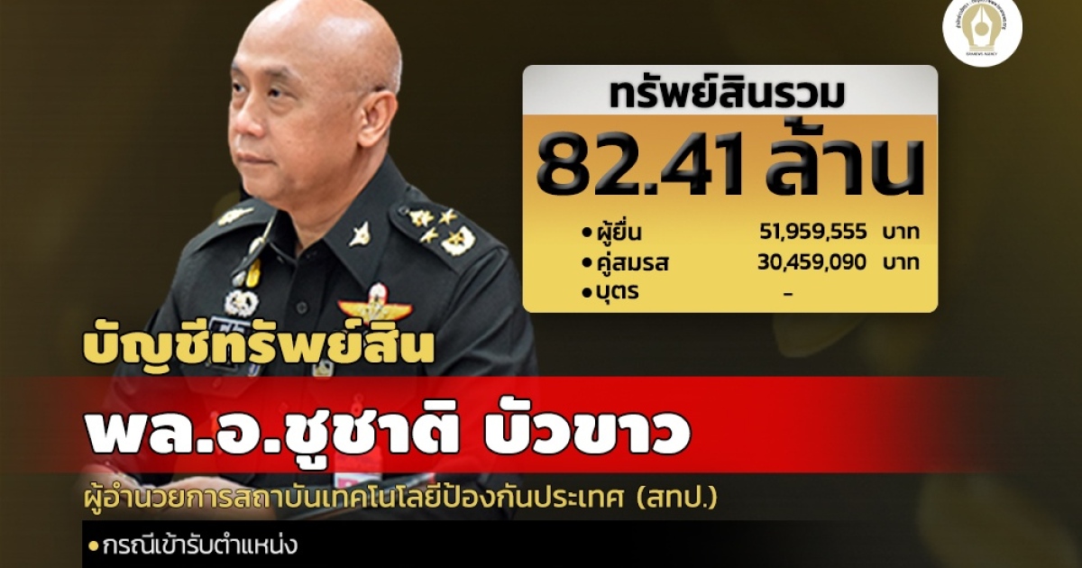 เมื่อวันที่ 30 มี.ค.2565 สำนักงานคณะกรรมการป้องกันและปราบปรามการทุจริตแห่งชาติ (ป.ป.ช.) เปิดเผยบัญชีทรัพย์สินและหนี้สินและเอกสารประกอบของผู้ดำรงตำแหน่งระดับสูง รายของ พล.อ.ชูชาติ บัวขาว อดีตรองปลัดกระทรวงกลาโหม กรณีเข้ารับตำแหน่ง ผู้อำนวยการสถาบันเทคโนโลยีป้องกันประเทศ (สทป.) เมื่อวันที่ 3 ม.ค.2565 รวมทรัพย์สินทั้งสิ้น 82,418,645.46 บาท หนี้สิน 9,496,871.70 บาท