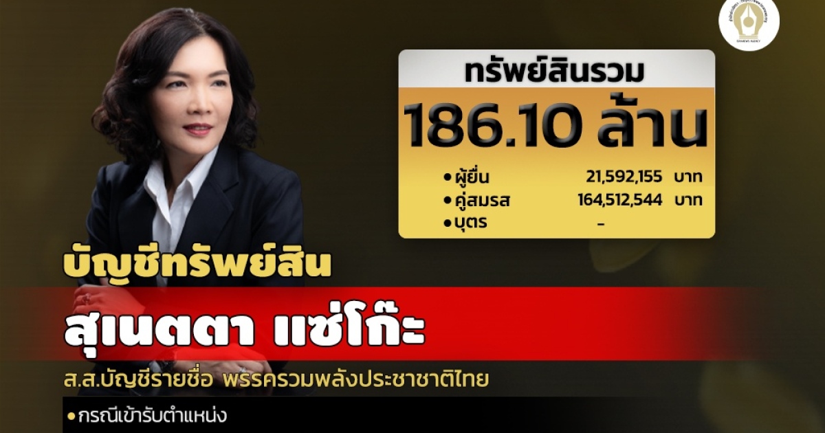 เมื่อวันที่ 25 ก.พ.2565 สำนักงานคณะกรรมการป้องกันและปราบปรามการทุจริตแห่งชาติ (ป.ป.ช.) เปิดเผยบัญชีทรัพย์สินและหนี้สินและเอกสารประกอบของผู้ดำรงตำแหน่งระดับสูง รายของ นางสุเนตตา แซ่โก๊ะ ส.ส.บัญชีรายชื่อ พรรครวมพลังประชาชาติไทย กรณีเข้ารับตำแหน่ง เมื่อวันที่ 3 พ.ย.2564 รวมมีทรัพย์สินทั้งสิ้น 186,104,699.78 บาท หนี้สิน 1,226,815.51 บาท