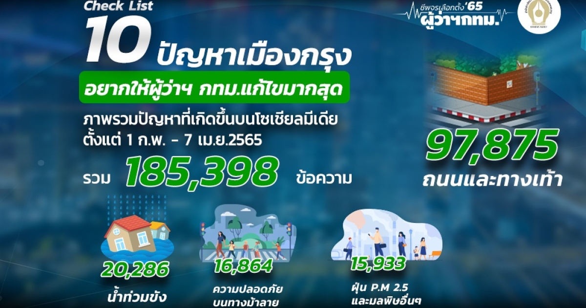 สำนักข่าวอิศรา ร่วมกับบริษัท เรียล สมาร์ท จำกัด จัดทำ Social Listening เกาะติดความเคลื่อนไหวการเลือกตั้งผู้ว่าราชการกรุงเทพมหานคร (ผู้ว่าฯกทม.) ที่จะเกิดขึ้นในวันที่ 22 พ.ค.2565 ในชื่อโครงการ 'ชีพจรเลือกตั้งผู้ว่าฯกทม.'65' ใน 10 ปัญหาที่โลกออนไลน์อยากให้ผู้ว่าฯ กทม.คนใหม่แก้ไข เกินครึ่งพูดถึง ‘ทางเท้าชำรุด’ อยากให้ปรับปรุงมากที่สุด