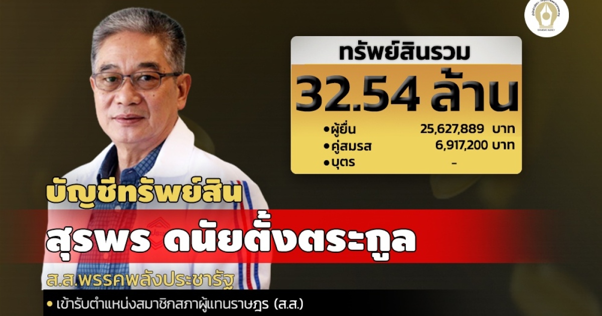 เมื่อวันที่ 12 เม.ย.2565 ป.ป.ช.เปิดเผยบัญชีทรัพย์สินและหนี้สินและเอกสารประกอบของผู้ดำรงตำแหน่งระดับสูง รายของนายสุรพร ดนัยตั้งตระกูล กรณีเข้ารับตำแหน่งสมาชิกสภาผู้แทนราษฎร (ส.ส.) แบบบัญชีรายชื่อ พรรคพลังประชารัฐ เมื่อวันที่ 20 ม.ค.2565 รวมทรัพย์สินทั้งสิ้น 32,545,090.07 บาท หนี้สิน 51,595.83 บาท