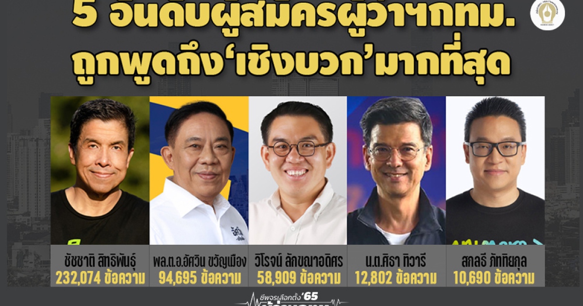 ถอดรหัส 3 เดือน 1.9 ล้านข้อความ สิ่งที่โลกออนไลน์ชื่นชอบผู้สมัครผู้ว่าฯกทม.10 อันดับแรก พบว่ามีบทสนทนาใน 'เชิงบวก' กว่า 419,504 ข้อความ