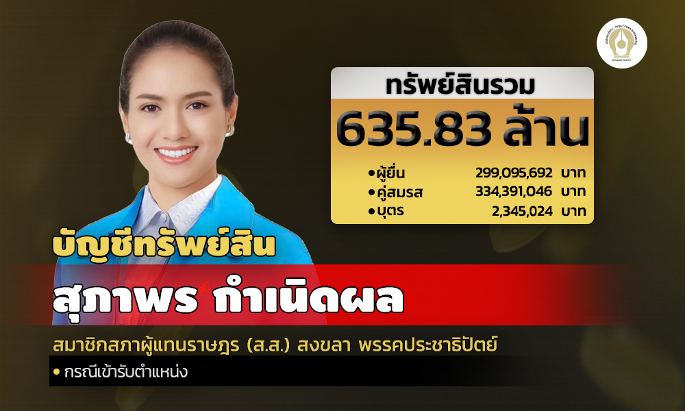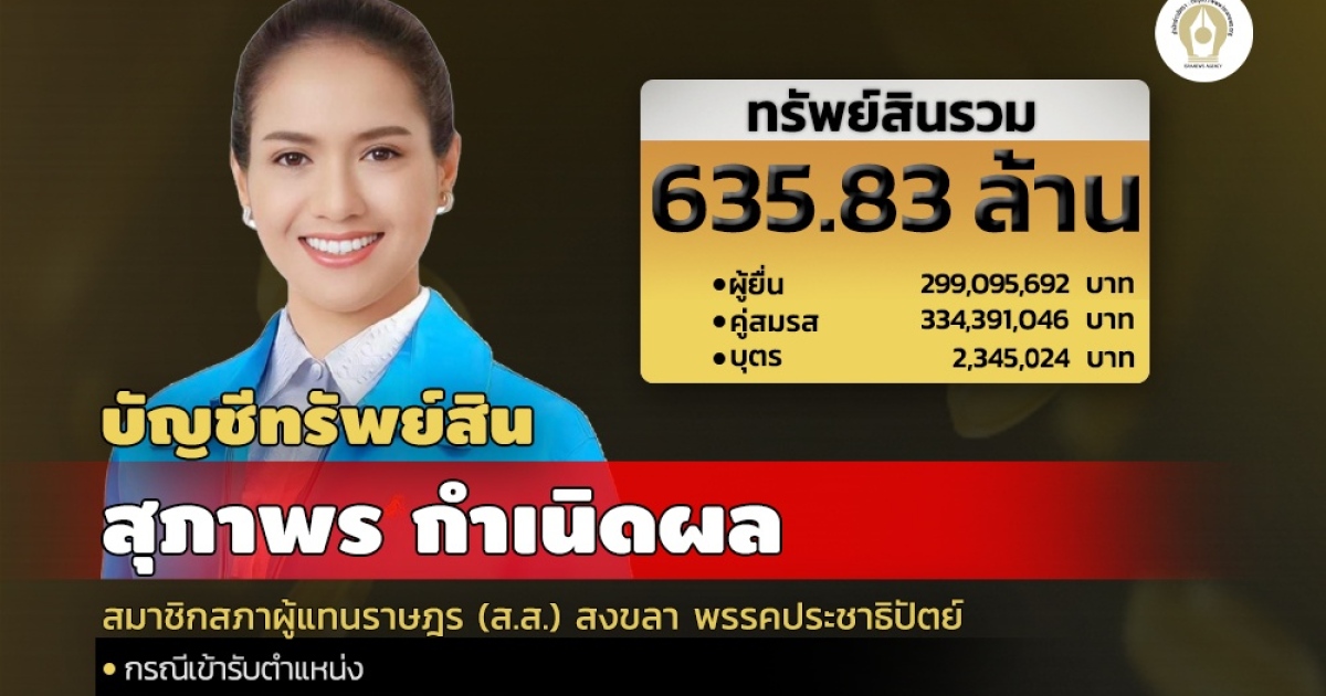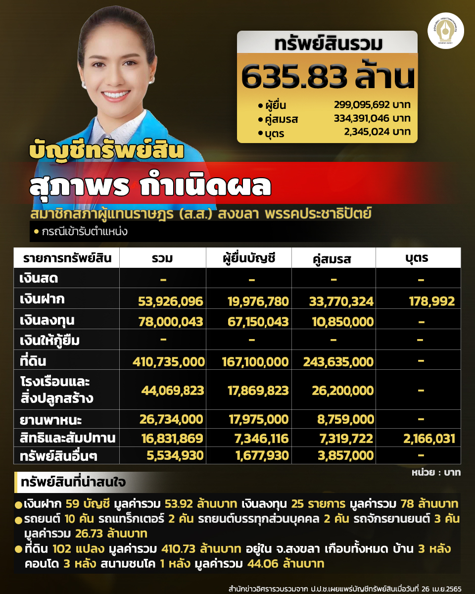 เมื่อวันที่ 26 เม.ย.2565 สำนักงานคณะกรรมการป้องกันและปราบปรามการทุจริตแห่งชาติ (ป.ป.ช.) เปิดเผยบัญชีทรัพย์สินและหนี้สินและเอกสารประกอบของผู้ดำรงตำแหน่งระดับสูง รายของ น.ส.สุภาพร กำเนิดผล กรณี เข้ารับตำแหน่ง สมาชิกสภาผู้แทนราษฎร (ส.ส.) สงขลา เขต 1 พรรคประชาธิปัตย์ เมื่อวันที่ 27 ม.ค.2565 รวมทรัพย์สินทั้งสิ้น 35,816,573.20 บาท (เงินฝาก 15 บัญชี 5,852,990.69 บาท ที่ดิน 8 แปลง 11,498,200 บาท บ้าน 3 หลัง 2,374,040 บาท) หนี้สิน 239,316 บาท