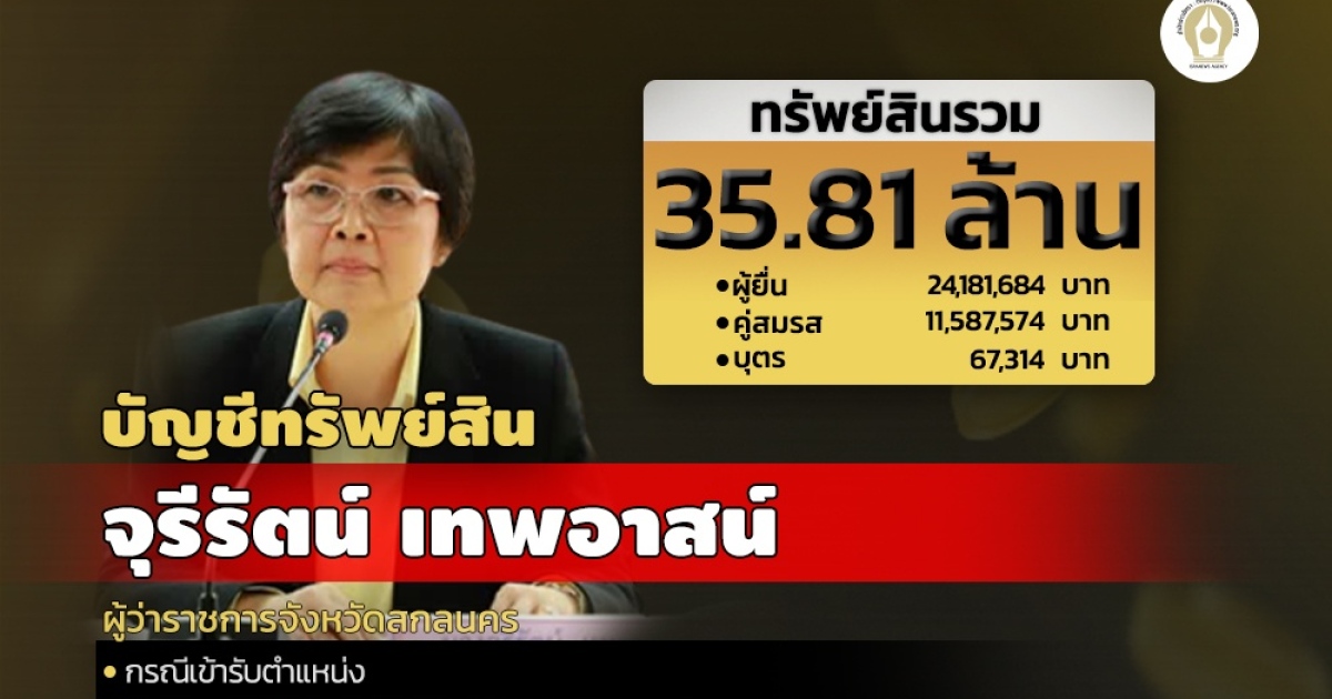 เมื่อวันที่ 22 เม.ย.2565 ป.ป.ช.เปิดเผยบัญชีทรัพย์สินและหนี้สินและเอกสารประกอบของผู้ดำรงตำแหน่งระดับสูง รายของ นางจุรีรัตน์ เทพอาสน์ ผู้ว่าราชการจังหวัดสกลนคร กรณีทุก 3 ปีตลอดเวลาที่ยังดำรงตำแหน่งเป็นเจ้าหน้าที่รัฐ เมื่อวันที่ 4 ม.ค.2565 รวมทรัพย์สินทั้งสิ้น 35,816,573.20 บาท หนี้สิน 239,316 บาท