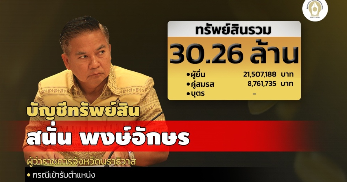 เมื่อวันที่ 12 เม.ย.2565 ป.ป.ช. เปิดเผยบัญชีทรัพย์สินและหนี้สินและเอกสารประกอบของผู้ดำรงตำแหน่งระดับสูง รายของ นายสนั่น พงษ์อักษร ผู้ว่าราชการจังหวัดนราธิวาส กรณี เข้ารับตำแหน่ง เมื่อวันที่ 15 ธ.ค.2564 รวมทรัพย์สินทั้งสิ้น 30,268,853.57 บาท หนี้สิน 6,521,000 บาท