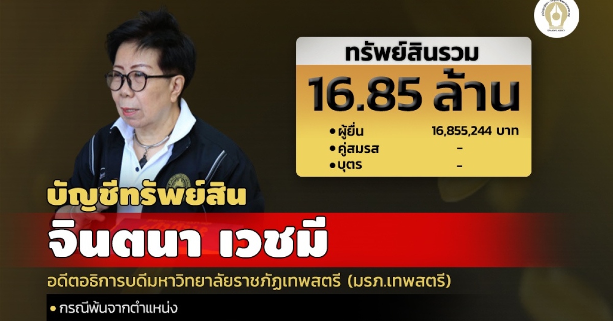 เมื่อวันที่ 29 เม.ย.2565 สำนักงานคณะกรรมการป้องกันและปราบปรามการทุจริตแห่งชาติ (ป.ป.ช.) เปิดเผยบัญชีทรัพย์สินและหนี้สินและเอกสารประกอบของผู้ดำรงตำแหน่งระดับสูง รายของ นางจินตนา เวชมี กรณี พ้นจากตำแหน่งอธิการบดีมหาวิทยาลัยราชภัฏเทพสตรี (มรภ.เทพสตรี) เมื่อวันที่ 26 ก.พ.2565 รวมทรัพย์สินทั้งสิ้น 16,855,244.86 บาท หนี้สิน 2,472,185.45 บาท