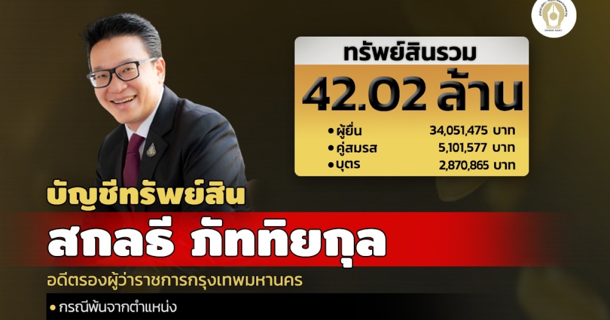 เมื่อวันที่ 5 พ.ค.2565 สำนักงานคณะกรรมการป้องกันและปราบปรามการทุจริตแห่งชาติ (ป.ป.ช.) เปิดเผยบัญชีทรัพย์สินและหนี้สินและเอกสารประกอบของผู้ดำรงตำแหน่งระดับสูง รายของ นายสกลธี ภัททิยกุล กรณี พ้นจากตำแหน่งรองผู้ว่าราชการกรุงเทพมหานคร เมื่อวันที่ 7 มี.ค.2565 รวมทรัพย์สินทั้งสิ้น 42,023,918.72 บาท หนี้สิน 379,085.54 บาท