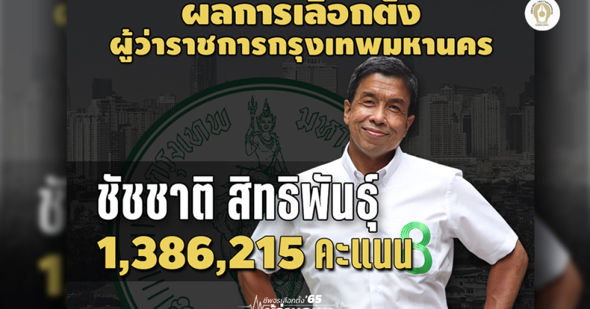 สรุปผลการเลือกตั้งอย่างไม่เป็นทางการ ของผู้ว่าราชการกรุงเทพมหานคร (ผู้ว่าฯ กทม.) ณ วันที่ 23 พ.ค.2565 เวลา 01.55 น. นับคะแนนครบ 6,817 หน่วย นายชัชชาติ สิทธิพันธุ์ ได้รับคะแนนเสียงเลือกตั้งสูงสุด จำนวน 1,386,215 คะแนน