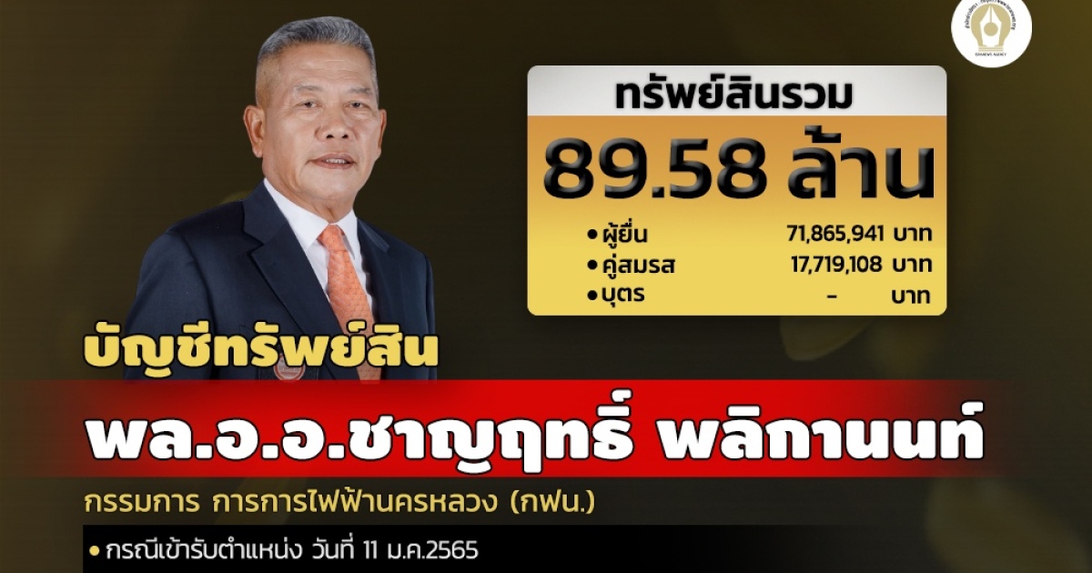 ทรัพย์สิน 89.58 ล้านบาท 'พล.อ.อ.ชาญฤทธิ์ พลิกานนท์' อดีตรอง ผบ.ทอ. นั่งกรรมการบอร์ด กฟน. สะสมทองคำแท่ง 3 กิโลกรัม พระทองคำ-พระเครื่อง 217 องค์ ประเมินค่าไม่ได้