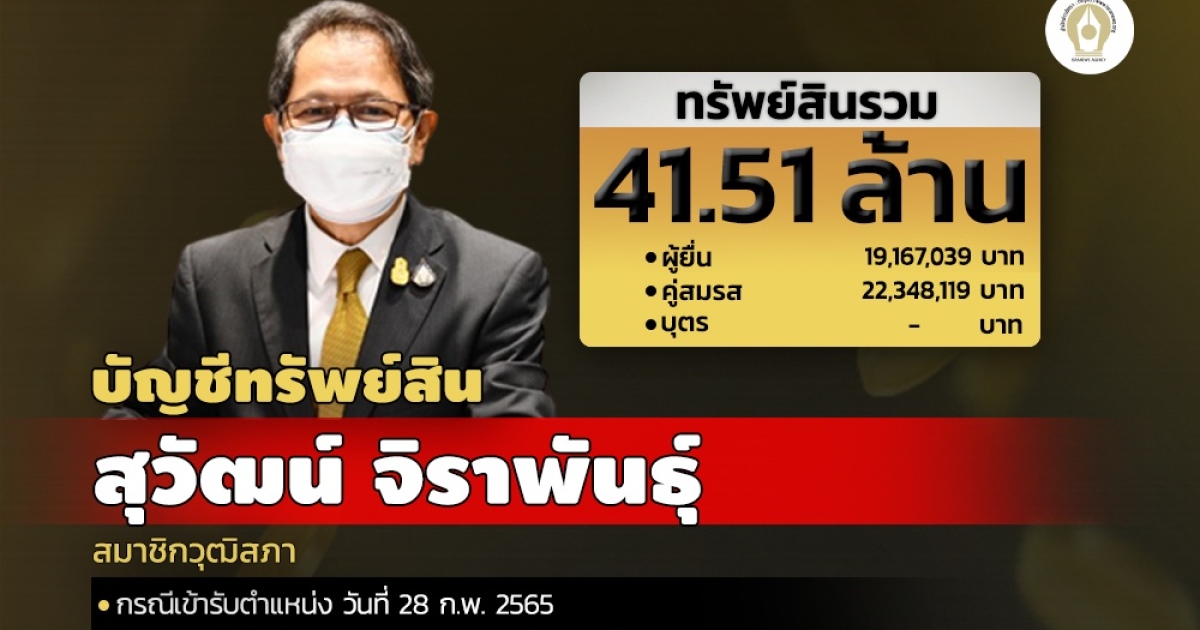 ทรัพย์สิน 41.51 ล้านบาท 'สุวัฒน์ จิราพันธุ์' อดีตรองปลัดก กต.เข้ารับตำแหน่ง ส.ว. เงินฝาก 17 บัญชี 13.27 ล้านบาท บ้าน-ที่ดิน 21.24 ล้านบาท รายได้ต่อปี 2.61 ล้านบาทจากเงินเดือน ส.ว.-มูลนิธิชัยพัฒนา-บำนาญข้าราชการ