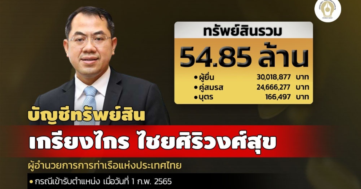 ทรัพย์สิน 54.85 ล้านบาท 'เกรียงไกร ไชยศิริวงศ์สุข' นั่ง ผอ.การท่าเรือฯ ที่ดิน 12 แปลง 38.75 ล้านบาท บ้าน 4 หลัง 4.42 ล้านบาท รายได้ต่อปี 4.25 ล้านบาทจากเงินเดือน โบนัส เบี้ยประชุม